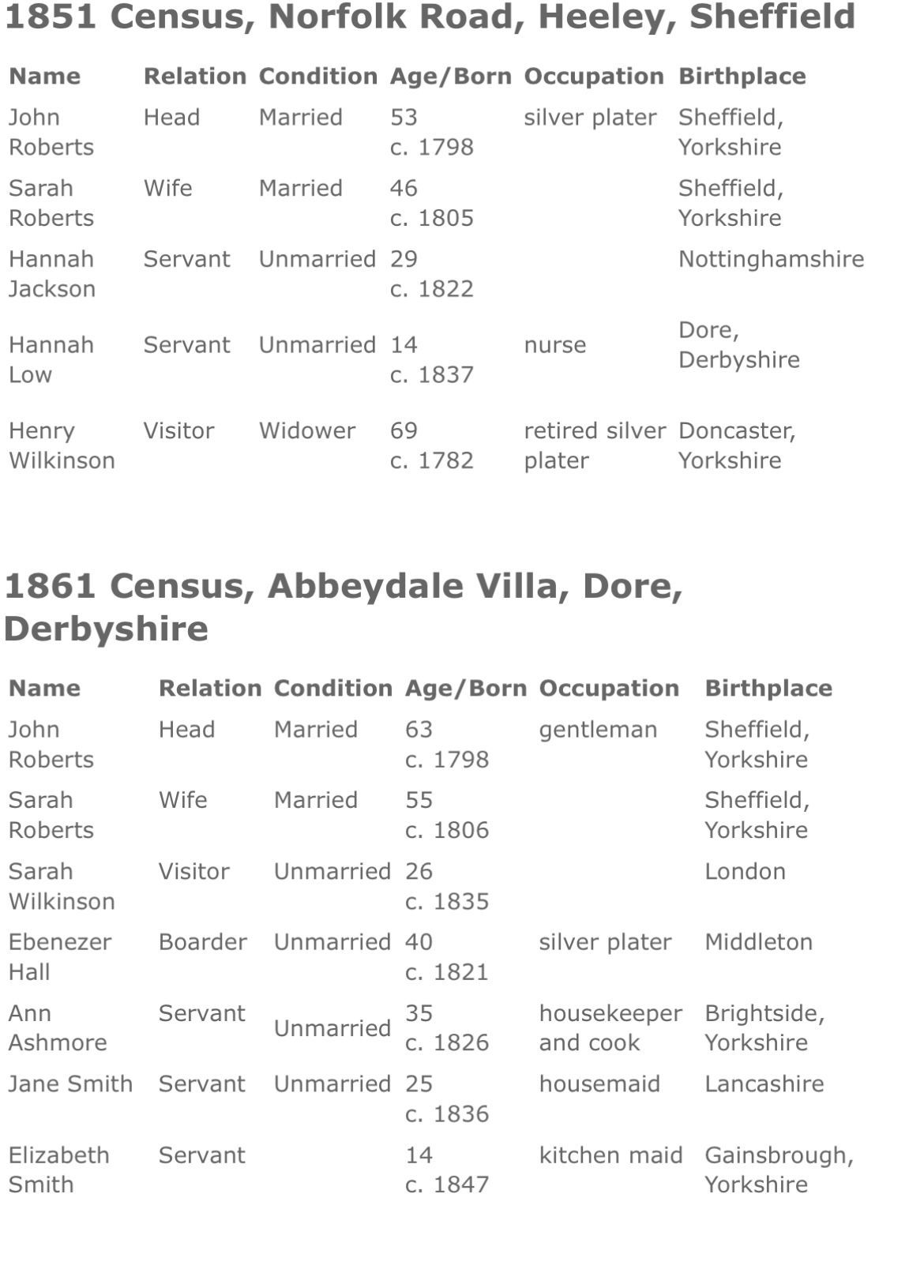 John Roberts 10 July 1888. The Will of John Roberts late of Abbey Dale Park in the Parish of Dore in the County of Derby Gentleman who died 11 April 1888 at Abbey Dale Park was proved at Derby by Ebenezer Hall the Younger of Stafford-street Park in the Parish of Sheffield in the County of York Manager at Martin Hall and Company Limited and Peter Wragg of Sheffield Secretary of Martin Hall and Company Limited the Executors. Personal Estate £19,877 10s. 5d. Resworn August 1889 £19,479 3s. 11d.