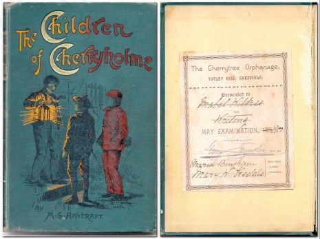 Sally sent us these two images of the front cover and the inside plate of a book presented to Mabel in May 1900 as a prize for her writing. The Orphanage had an annual Examinations Day which was open to the public and widely mentioned in local newspapers. The bookplate is signed by Sir George Franklin (1853-1916) who was a trustee and President of the Orphanage and the first commoner Lord Mayor of Sheffield as well as Chairman of both the Sheffield and Hallamshire Banking Company and the National Telephone Company. Examinations were administered by the Orphanage's Ladies Committee and on its behalf the bookplate has also been signed by Dame Maria Bingham (1837-1924) and Miss Mary W. Keddie (1844-1930). The book The Children of Cherryholme was chosen, surely, because of the similarity of the name to Cherrytree. It was written by Margaret Scott Haycraft (1855-1936) and was first published in London in 1895 by S.W. Partridge & Co.