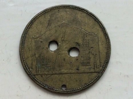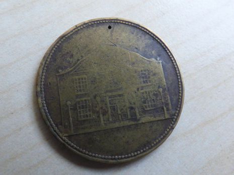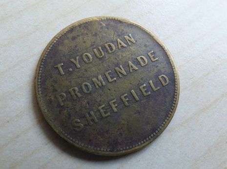 These tokens were used to gain entance to the Promenade section of the Royal Casino (later renamed Surrey Music Hall) at 66 West Bar, Sheffield. The music hall was owned by Thomas Youdan, who briefly lived at Totley Vale Cottage (Grove House). Follow the link to read the story of the music hall and its destruction by fire in 1867.