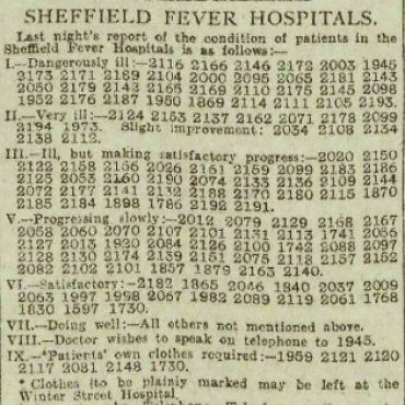 A report also claimed that the hills of Sheffield were proving too difficult for the horsedrawn ambulances. There were a few early motorised vehicles in operation, but insufficient in number to meet demand. Each patient was issued with a number. The morning newspapers printed a daily bulletin to keep relatives updated on any changes in their condition: