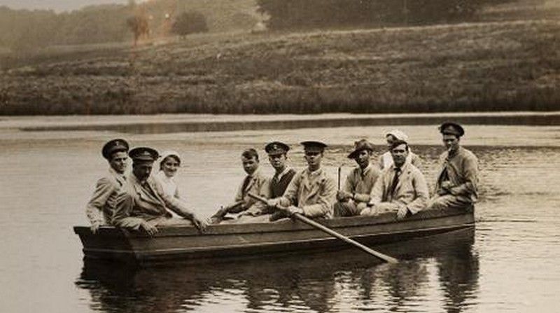 Injured soldiers recuperating on the boating lake, Longshaw Lodge Convalescent Home for Wounded Soldiers