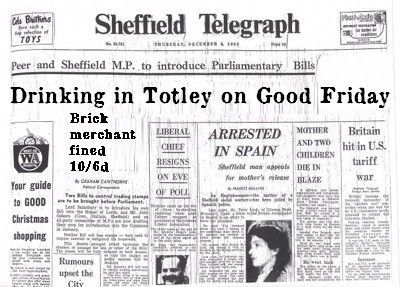 Edward Brown, a brick merchant of Holmesfield, was summoned for drinking in a beerhouse during prohibited hours. Police constable Hswkins said that on Good Friday morning at a quarter past 10 he visited Mrs Fearnehough's beerhouse at Totley and found the defendant drinking in the taproom, fined 10/6d including costs. Mr. Robinson and Mr. Robinson and Mr. Thomas Mitchell labourer of Totley were summonsed for a similar offence committed on the same day at Clement Needham's beerhouse of Totley and were muleted in a like penalty as also was Joseph Coates, farmer at Dore, for drinking in the Dore Moor Inn on the same morning Police Constable Hawkins proved the case.