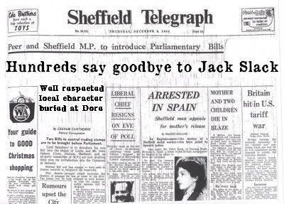 The death of Jack Slack, as he was familiarly known in and around the Dore neighbourhood, has removed a well-known figure from this district of Derbyshire. He was a sort of all-round handyman - the man who got in coals, cleaned the windows, assisted the keepers and farmers of the district, and did any odd jobs.
