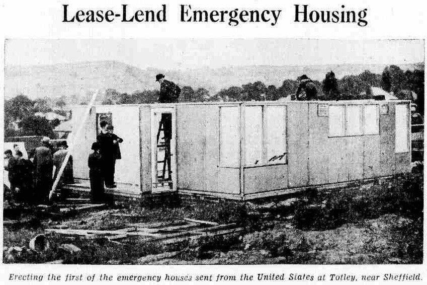 The first of the 20,000 prefabricated temporaray dwellings which the United States is supplying to this country under Lease-Lend is being erected on the Totley Estate, Sheffield. Next Wednesday one of the 20,000 applicants for houses in the city will be chosen as the lucky first tenant. In all probability he will be a Serviceman, or an ex-Serviceman from this war, for the Estates Committee of the Corporation have decided to allocate 50 per cent. of the houses to them. In the next few weeks 175 of these bungalows, which arrived a week ago in packing cases, will be erected on the site by a local firm of builders. The men, at the moment, are strange to the job, but when they have gained experience in this type of building, a Ministry of Works official tol me they will be be able to put up one building a day. The foundations were ready when the first crate was unpacked yesterday and the walls of timber, fibre, and asbestos, insulated against heat and cold, put into place. The bungalows measure 24ft 2in. square, with a porch projecting 4ft. 1in. They contain a living-room, two bedrooms, kitchen, bathroom and lavatory. The kitchen has a gas cooker, electric immersion heater, wash boiler and shelving, but no refrigerator. There are plenty of shelves for the housewife, but because there is a shortage of timber in the United States there are no doors to the kitchen cupboards apart from those to the dresser. Nor, for the same reason, are the built-in wardrobes in the bedrooms provided with doors. The bungalows are designed to have a life of 10 years. In Sheffield, where the Corporation has a housing programme for 30,000 permanent and 2,000 temporary dwellings of various types, these Amercican bungalows will be let at 10s. a week with rates, which are expected to be about 4s.