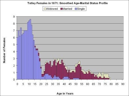 This Excel-compatible spreadsheet summarizes the numbers of people in each of the Censuses between 1851 and 1911 by their gender, age and marital status and, after statistical smoothing, illustrates the results in graphs such as the one below for females in 1871.