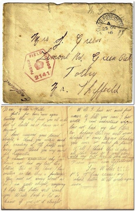 This letter is thought to be the last one received by his mother prior to his death. It says nothing of the dreadful conditions the soldiers were enduring as their correspondence was heavily censored. Neither does the envelope give any indication of where it was posted.