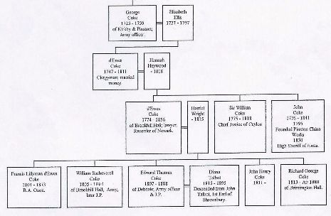 D’Ewes Coke was born on 22 December 1774. He was a Barrister-at-Law, the Recorder for both Newark and Grantham Corporation from 1805, and Land Agent to Duke of Rutland from 1811 to 1839. On 2 November 1797 he married Harriet, daughter of Thomas Wright, Esq. of Mapperley Hall, Notts, and they had ten children, five boys and five girls.