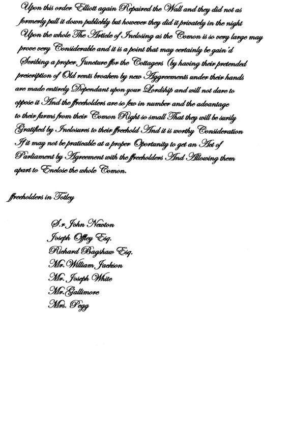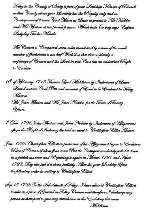 This is a transcription of an undated document [circa 1763] held by Nottingham University and from the archive of Lord Middleton. It appears to be a summary of events in the Totley area during 18thcentury, informing Lord Middleton, who was wishing to enclose an area of land around Totley.