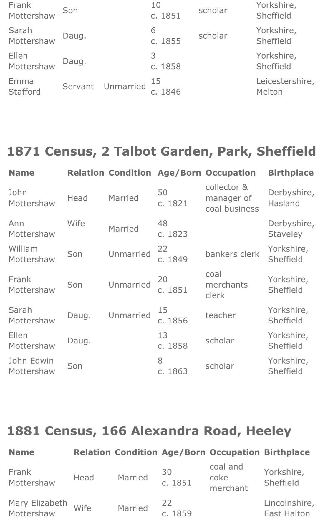 MOTTERSHAW Frank of 201 Carterknowle-road Sheffield died 18 September 1932 Probate London 25 March [1933] to Mary Elizabeth Mottershaw widow and Walter Nelson Mottershaw dealer. Effects £2007 11s 7d.