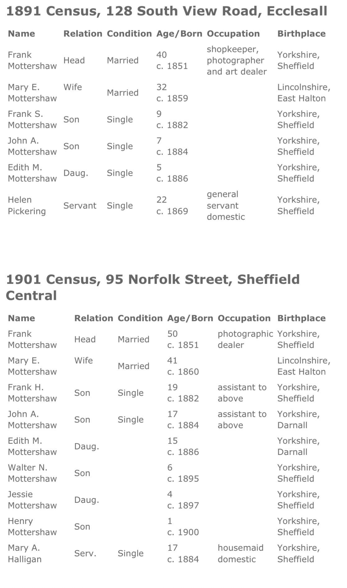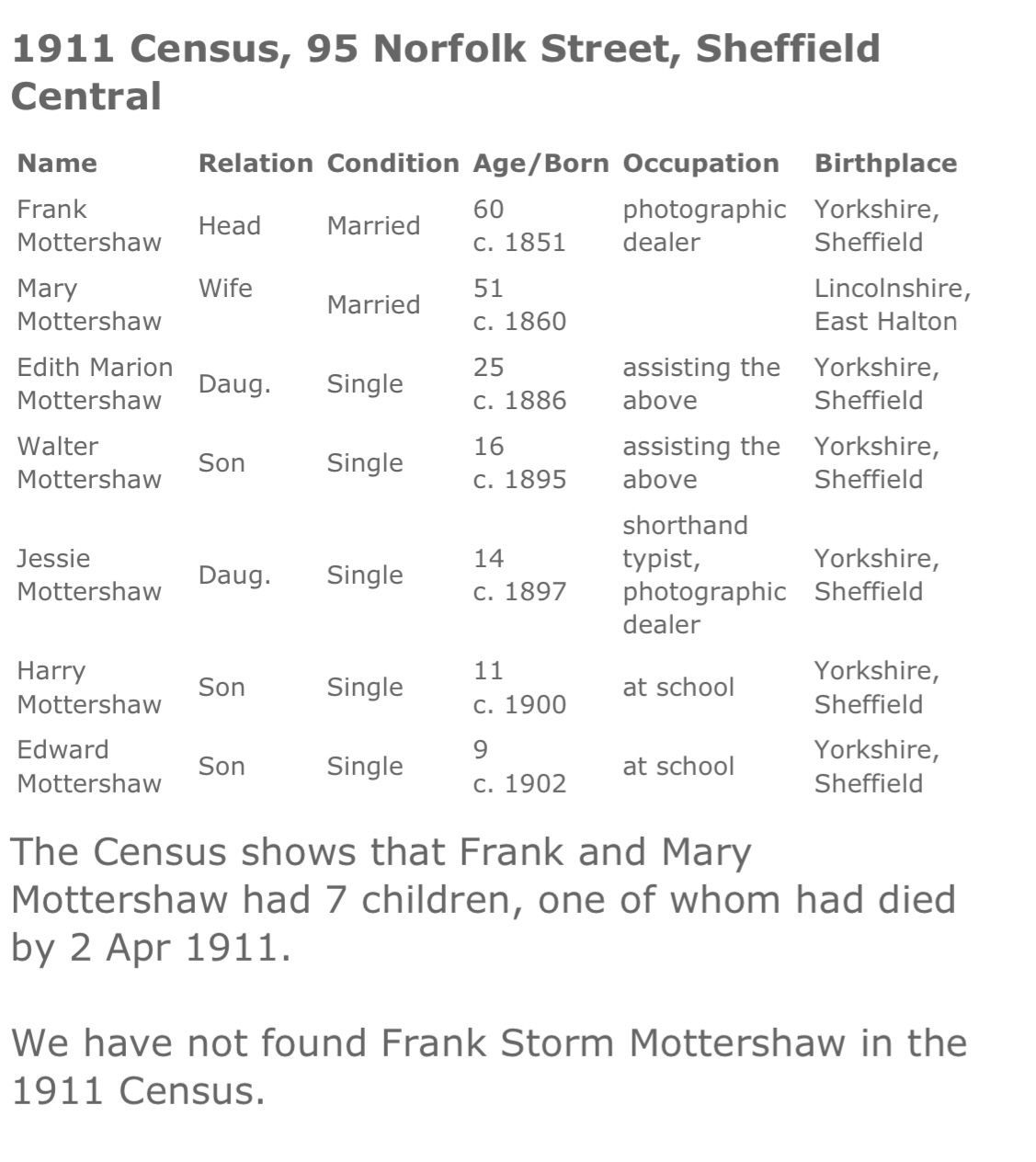 We are very grateful to John Mottershaw, Frank Mottershaw's grandson, who has supplied us with a wealth of information on the history of his family and the Sheffield Photo Co. Ltd., elements of which are reproduced below.
