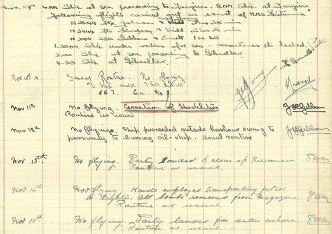 Page from the ship's log of HMS Engadine. (c) copyright Fleet Air Arm Museum Archives