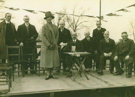 Mrs Sarah Milner O.B.E. declares Totley Recreation Ground open, 23 March 1929. Left to right: Colin Thompson, James Gledhill, Sarah Milner, ?, Mr Wells, Charlie Swift, Frank Cook, J. R. Rodgers, Len Marcroft.