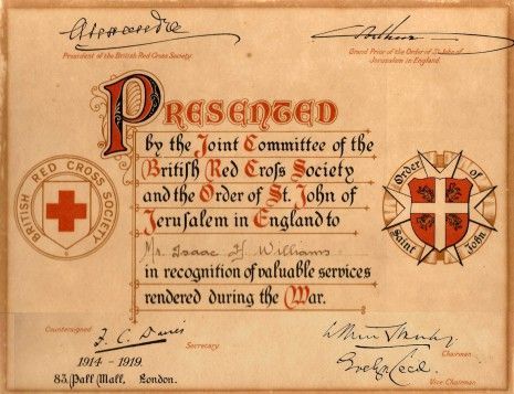 This splendid certificate was awarded to Isaac Henry Williams in recognition of his services as a stretcher bearer during the First World War. It was found recently amongst her late father's belongings by Pauline Memmott and, as there is no connection with her own family, she would like to return it to Isaac's descendants.