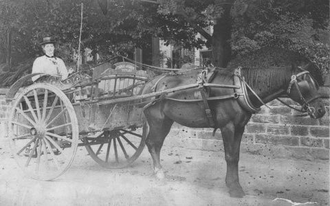 However there was still room for another delivery man nicknamed 'Pot-mold', real name Philip Coates. Pot-mold earned his name on account of his habit of shouting "pot-mold" all the way up the main road to announce his arrival. Pot-mold, a hard yellow natural stone that cost 1d per piece, was used for rubbing around the edges of steps where decoration was not the primary intention, whereas Donkey-stone, also sold by Pot-mold for 2d, a pre-formed block was used where a little decoration was called for, or a more refined look like the front door step. Of course, Pot-mold sold all other things one might need in the way of polishes for shoes, furniture, brushes, dusters, in fact, between them Mr. Gillespie and Pot-mold supplied everything one could possibly need for the running of a happy household, including the garden and toilets. For disposal of the worn-out, shrunken, and otherwise unwanted items there was the Rag and Bone man, who came round once a month with balloons flying in the wind from his dray full of cast-offs, throw- outs, shrunken jumpers and clothing too small for further hand- me-downs. However small the item begged by the children from Mum, in return was the gift of a balloon, a paper windmill or, if the goods warranted it, a penny.