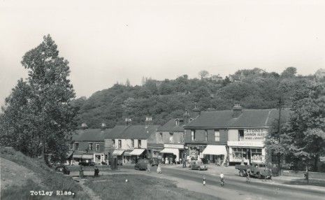 Moving along to the bottom of Devonshire Road was Mr Naylor’s garage. His sister Vera served the petrol. They retired and eventually Tesco now has it. The telephone building was next door, which then became Totley library and is now a hairdressers. Mr Gibson owned the next shop – solely a tobacconists with no sweets! Rogers had it through World War 2, then Vincent Martin bought it till he retired, and Jimmy, his son, had it for many years. Now it is Seasons gift and coffee shop. A Mr Pearson had the next shop, until the Bradshaw family took it over, and they made a great business of it. Gerald and Bernard, the sons, used to deliver Friday and Saturday until 9:30 pm, and were always last to come to the dances at Totley Reformed Church! The corner shop was always known as a Bushey Wood Stores, owned by the Wint family for many years, Ormes of Bakewell took it over. It was subsequently Gowers and Burgins, and then Spar and is now Lush bathrooms.