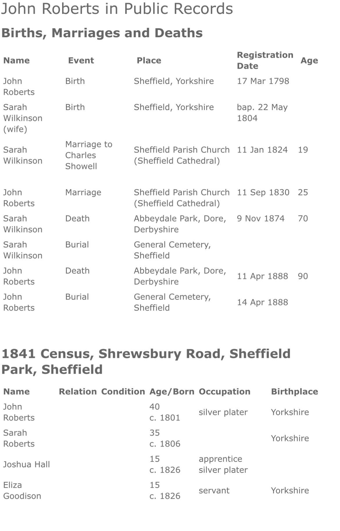 John Roberts was apprenticed in Sheffield to a gunsmith and it is thought that he followed that occupation for several years after the expiration of his indentures. His introduction to the silver trade is thought to have been, in part at least, a consequence of his marriage in 1830 to Sarah, the widow of Charles Showell, a gun manufacturer, and the daughter of Sarah and Henry Wilkinson, a Sheffield silversmith.