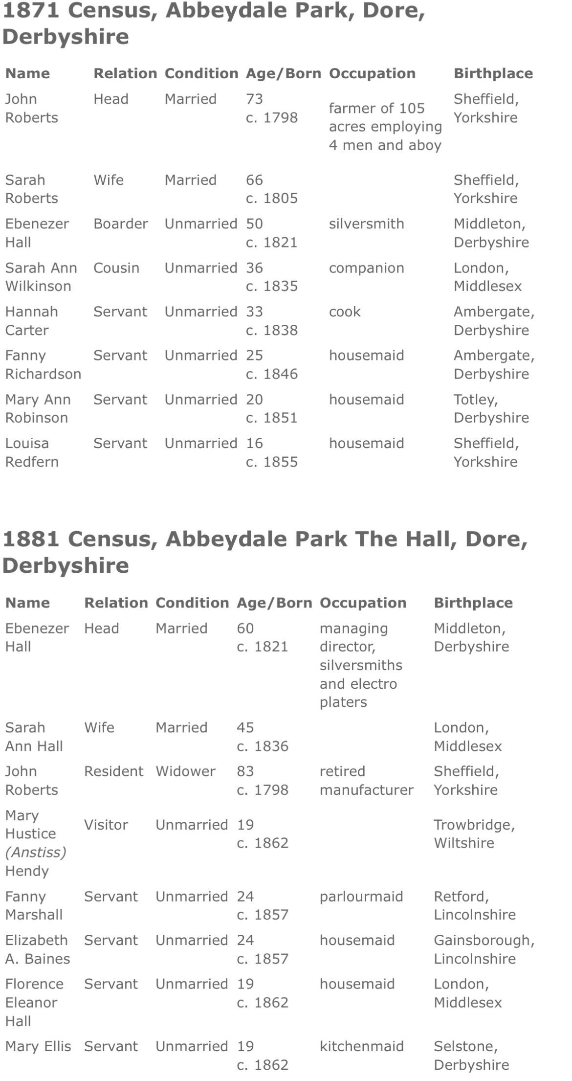John Roberts 10 July 1888. The Will of John Roberts late of Abbey Dale Park in the Parish of Dore in the County of Derby Gentleman who died 11 April 1888 at Abbey Dale Park was proved at Derby by Ebenezer Hall the Younger of Stafford-street Park in the Parish of Sheffield in the County of York Manager at Martin Hall and Company Limited and Peter Wragg of Sheffield Secretary of Martin Hall and Company Limited the Executors. Personal Estate £19,877 10s. 5d. Resworn August 1889 £19,479 3s. 11d.