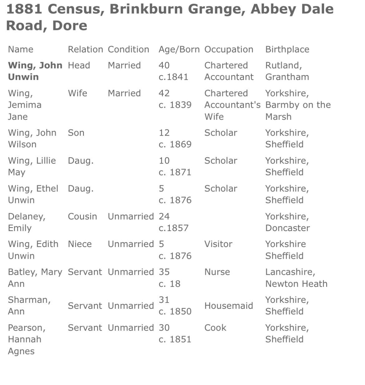 The couple were living at Carlton Villa, Upperthorpe when a daughter, Louisa Ann, was born on 27 September 1865. Proof of a longstanding family connection with Sheffield, perhaps, is that when John Unwin Wing was Company Secretary of the Sheffield Carriage Company, its manager was John Wing Unwin! The two men even lived in the same area of the city: John Unwin Wing in Upperthorpe and John Wing Unwin in Shalesmoor.
