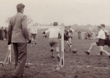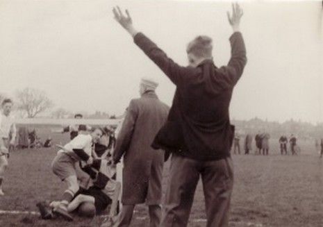 In this second action photograph, the gentleman in the overcoat behind the goal with his back to the camera is the team coach.