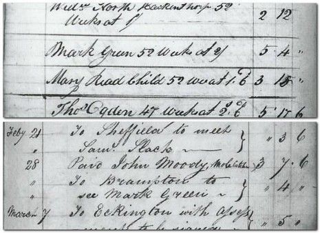 From fragmentary accounts of the Totley Overseers of the Poor, it appears that Mark Green received an allowance of 2 shillings per week from 1832, a sum that was increased by 6d. following a visit to him by the Overseers in February 1836. The accounts for 1842 mention that this was because he was disabled and unable to work. Alice Green died in 1845 at the age of 59 and was buried on 28 June. In the 1851 census, Mark was a widower living in Red Row with his daughter Ann, son-in-law Joseph Haslam and their two sons Henry (b. 1842) and William (b. 1848). Mark Green died at Red Row, Brampton of "gradual decay" on 22 February 1853, aged 77, and was buried on 24 February.