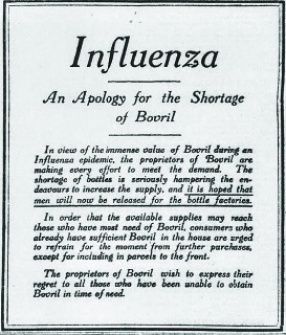 Articles were frequently featured in which favourable opinions were made about the make/price and availabilty of someone's latest life-saving idea. 1918 versions of the false news and scams to be found on social media during this present pandemic. People are still gullible! Products disappeared off the shelves - sound familiar?! Drinking Oxo or Bovril was thought to be of great benefit. So much so that the inability to supply troops was of concern, forcing the manufacturers to place this apology and request in the papers.