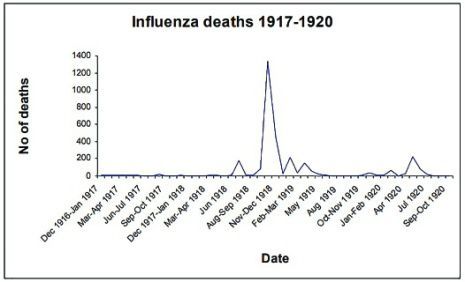 However, deaths recorded by the Medical Officer of Health for Sheffield are shown in the graph above and illustrate the devastation that Spanish Influenza wreaked on the city over a period of more than two years.