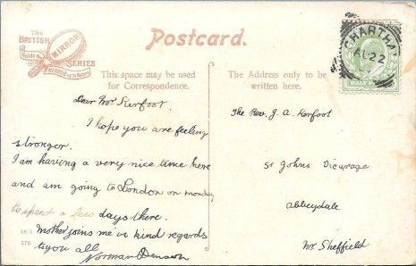 During his service he kept in touch with his brother-in-law and close friend Bert Booth and a postcard that he sent to Bert survives.