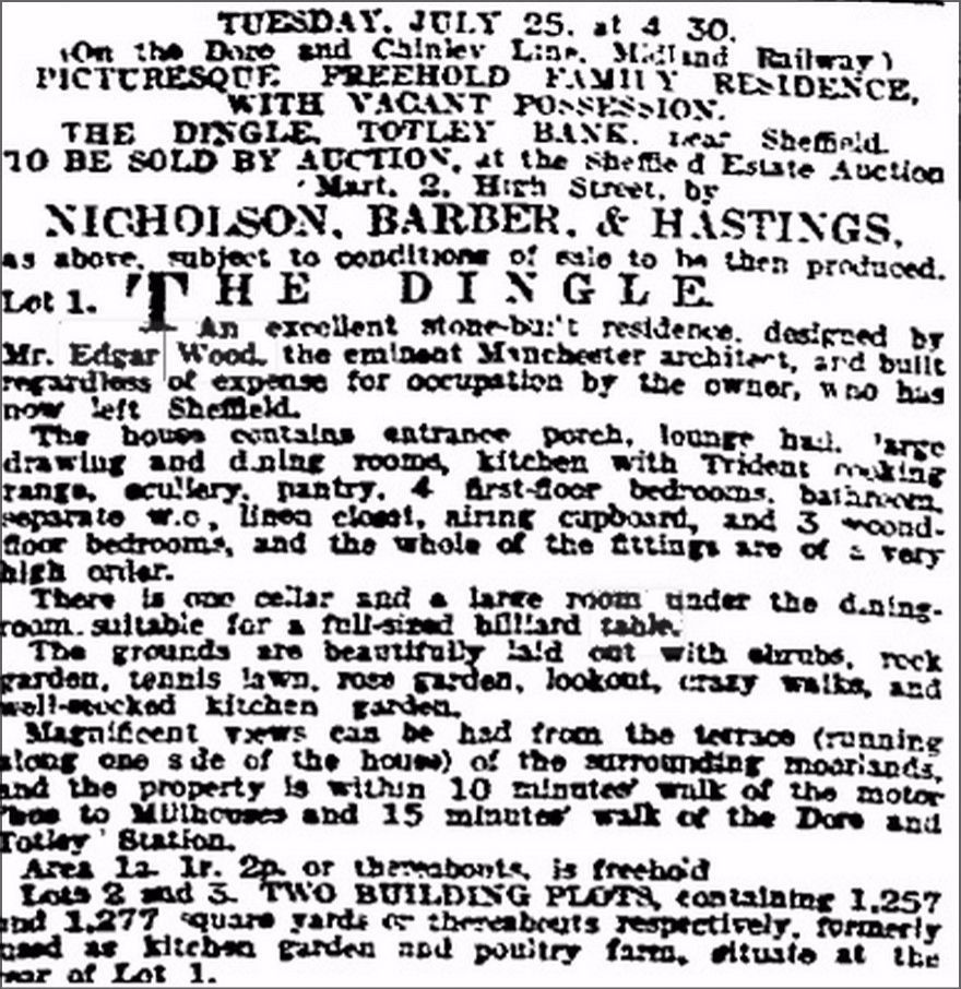 Anthony Cosgrove has written to us asking about a property in our area known as The Dingle, Totley Bank, designed by the arts and crafts movement architect Edgar Wood. Anthony had spotted a newspaper advertisement for the auction of the property in the 1920s.