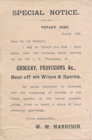 Why he changed his mind we do not know but the following year Walter Waller moved into a second, less physically demanding trade. When Leonard Thompson's application for a beer house license for the top shop on Totley Rise (number 71) was refused he moved on to take a pub in Heeley, and the tenancy of the building which was owned by Mappins Masbro' Old Brewery Limited was taken over by Walter Waller Marrison in March 1904.