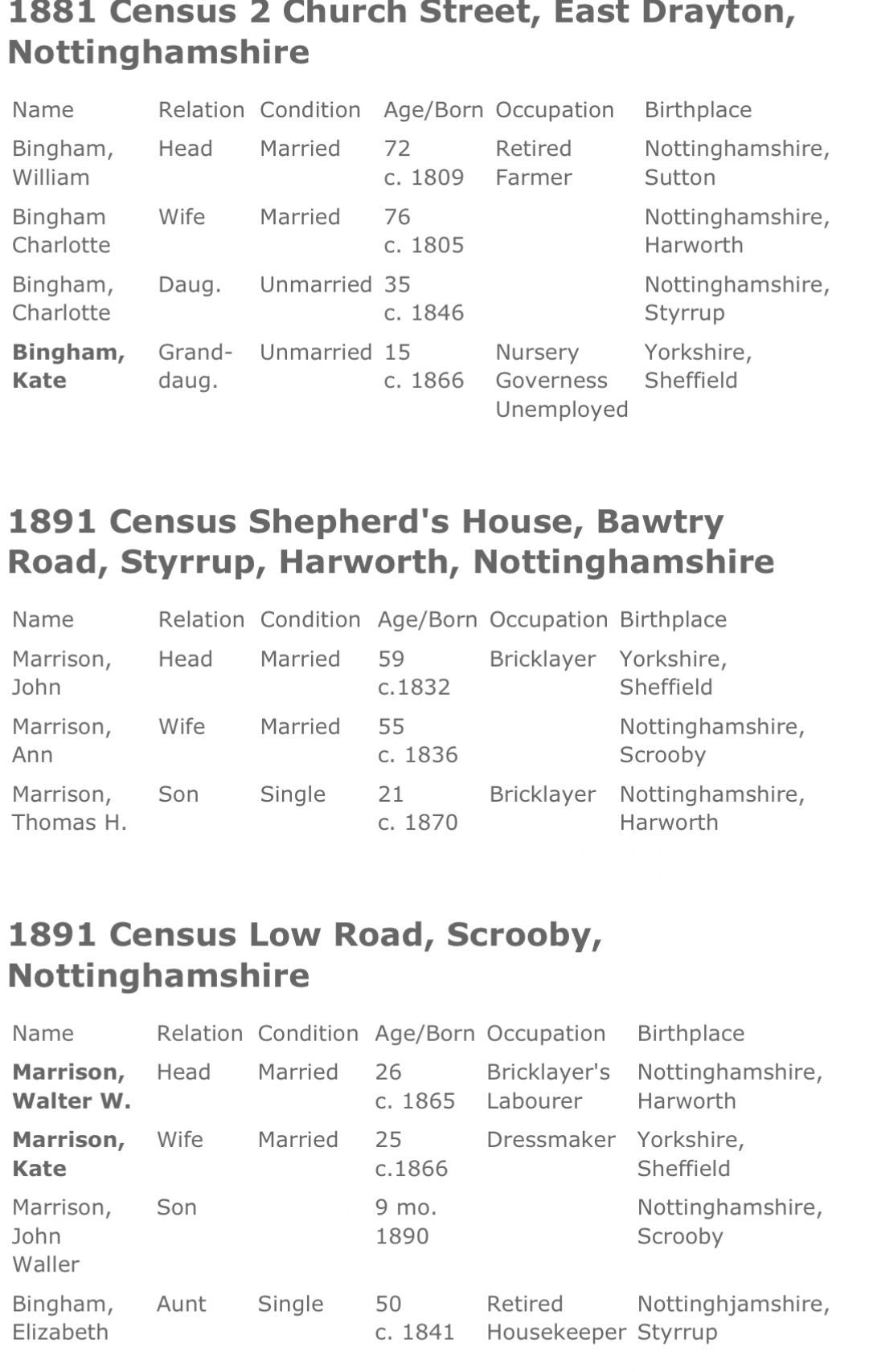 Kate Bingham went to live with her paternal grandparents in East Drayton where she was recorded as being an unemployed nursery governess in the 1881 census. Her sister, Annie, went to live with her aunt and uncle, Emma and John Stevenson, and became a junior drapers assistant by the time of the 1881 census.