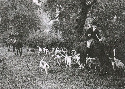 The Barlow Hounds hunting along the edge of Monk Wood c. 1946. Elsie Wilson (right) , Hunstman Bill Spry and Anne Wilson
