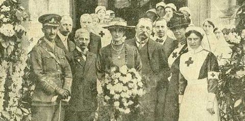 Dr Parsons is on the left of the Duchess and Dr Thorne is to her right. A guess is that Mrs Sarah Milner, in her capacity as President of the VAD Red Cross in the Dore and Totley area, is the lady with the large hat and wearing the bib of the Red Cross. Colonel Connell is on the extreme left and Matron is on the extreme right.