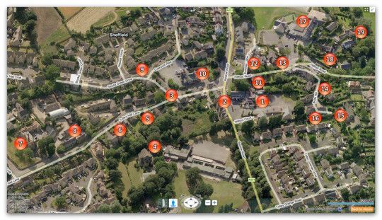 You may wish to refer to the maps in the associated Totley Village Walk Leaflet. This PDF file is a low resolution version of the leaflet and is available to view and download. It is in A3 portrait format but can be scaled to print at A4 size on a home printer.