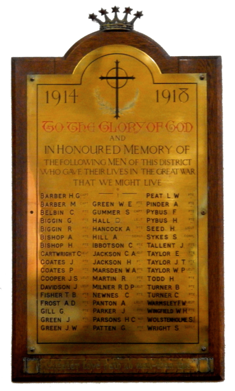 During World War One, Totley was a township for administrative purposes within the Registration District of Ecclesall Bierlow which straddled the Yorkshire-Derbyshire border. It had no parish church and was split between two ecclesiastical parishes. The old village centre and Totley Bents were in the parish of Christ Church, Dore. Green Oak and Totley Rise were in the parish of St. John the Baptist, Abbeydale. Hence Totley soldiers appear on a number of memorials in our area.